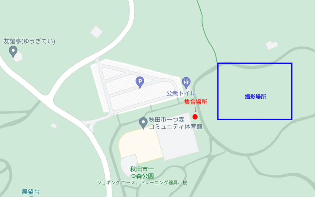 【ラブグラフ撮影会】秋田市一つ森公園(秋田県・秋田市)の集合場所と撮影場所 更新 集合場所・撮影場所の情報 <集合場所> 秋田市一つ森公園の下記赤丸付近(コミュニティ体育館裏)に集合をお願いします。 <撮影場所> 秋田市一つ森公園内の下記青枠「多目的広場およびジョギングコース」付近で撮影します。 <アクセス方法> ◆車でお越しの場合 「秋田市一つ森公園駐車場」から集合場所まで徒歩5分ほどになります。 公園詳細とアクセス方法