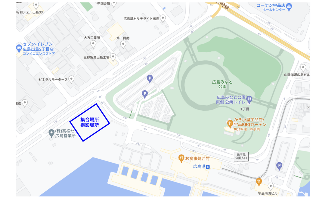 【ラブグラフ撮影会】広島みなと公園(広島県・広島市)の集合場所と撮影場所 更新 集合場所・撮影場所の情報 <集合場所> 広島みなと公園の下記青枠に集合をお願いします。 <撮影場所> 広島みなと公園の下記青枠で撮影します。 <アクセス方法> ◆電車でお越しの場合 「広島港駅」から集合場所まで徒歩3分ほどになります。 ◆車でお越しの場合 「広島みなと公園駐車場」から集合場所まで徒歩2分ほどになります。 会場詳細