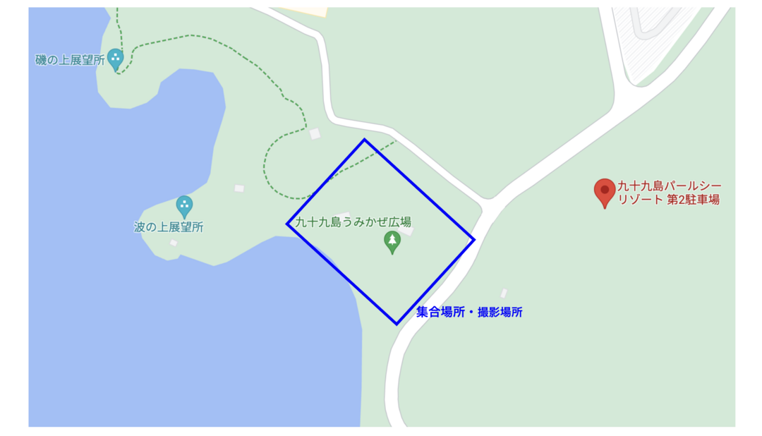 九十九島パールシーリゾートに隣接する「うみかぜ広場」画像青枠付近で集合・撮影を行います。