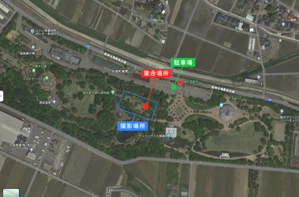 【ラブグラフ撮影会】福井県総合グリーンセンター(福井県・坂井市)の集合場所と撮影場所 更新 集合場所・撮影場所の情報 <集合場所> 下記画像赤丸周辺にて集合をお願いいたします。 <撮影場所> 公園内、下記画像青枠の桜見本園内にて撮影をいたします。 <アクセス方法> ◆公共交通機関でお越しの場合 JR福井駅から福井大学病院行き京福バス「グリーンセンター」下車 ◆車でお越しの場合 北陸自動車道 丸岡ICから車で10分 駐車料金:無料(94台) 住所:福井県坂井市丸岡町楽間15 公園詳細
