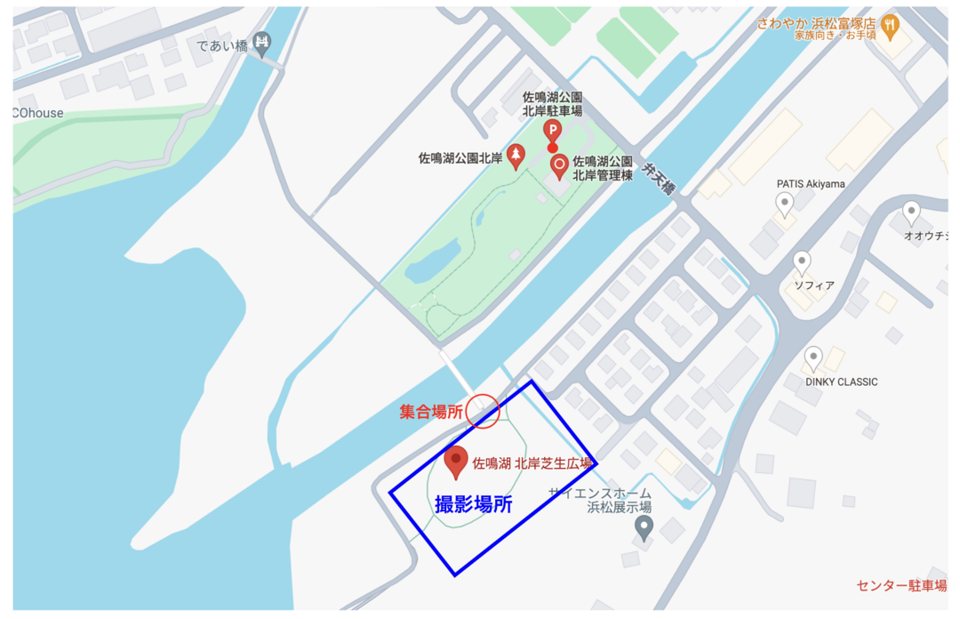【ラブグラフ撮影会】佐鳴湖公園(静岡県・浜松市)の集合場所と撮影場所 更新 集合場所・撮影場所の情報 <集合場所> 下記画像、「ふれあい橋」赤丸付近に集合をお願いします。 <撮影場所> 下記画像、「北岸芝生広場」青枠にて撮影をします。 <アクセス方法> ◆車でお越しの場合 東名高速道路浜松西ICから県道65号を経由し、県道48号を富塚町方面へ車で7キロ ・園内の駐車場をご利用いただけます。 下記画像の緑枠「北岸駐車場」が一番近いです。 集合・撮影場所 駐車場 公園詳細