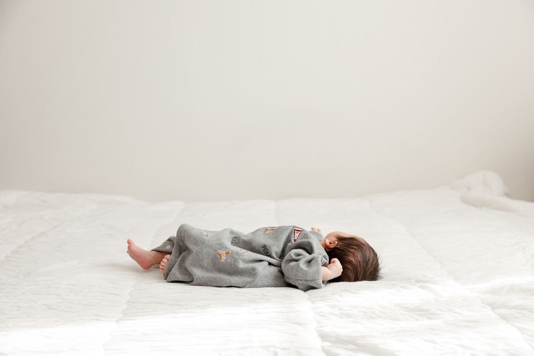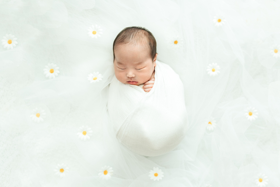 赤ちゃんを寝かしつけ、 おくるみを巻いて 撮影準備を進めます。